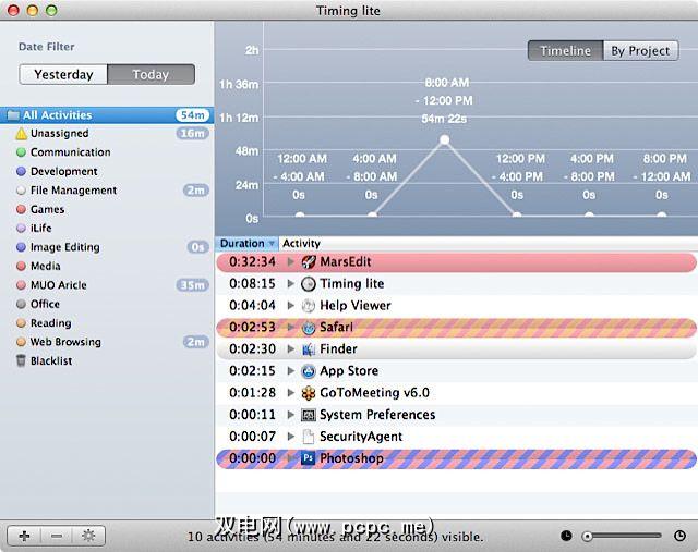 提高生产率的一种方法是意识到如何度过自己的时间。如果您的大部分工作都涉及计算机,那么一个名为Timing(价格为48.99美元)的OS X应用程序可以帮助您准确地跟踪工作时间。