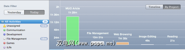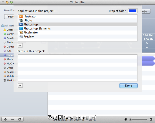 在侧边栏中,计时将各种活动分组。例如,在``图像编辑''下,``计时''会监视您在``万事通''应用程序Photoshop和iPhoto等应用程序中花费的所有时间。您可以右键单击类别以查看其正在记录的应用程序,还可以添加其他应用程序(例如文档和图像查看器预览),以使Timing可以在该区域中进行监视。