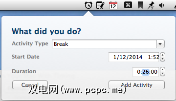 据我所知,Timing不会记录您计算机的中断时间,但是数据很重要,您可以通过单击菜单栏中的“时间"图标并选择添加自定义活动来手动添加它和其他未记录的数据。您还可以启用一项功能,要求返回到计算机后输入自定义活动。