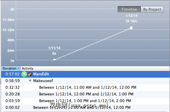 要编写PCPC.me文章,我的Timing项目由博客编写应用程序MarsEdit,Photoshop,Safari和屏幕捕获工具Snagit组成。默认情况下,Timing将监视这些应用程序,但是当将它们组合到一个项目中时,Timing提供了每个项目使用这些应用程序所花费的总时间。但是,就MarsEdit而言,虽然Timing记录了我在应用程序中编写的时间,但不幸的是它没有记录正在处理的特定文档。