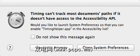 计时启动并启用它后,它几乎立即开始工作。在Mavericks下,计时除了应用程序外,还需要访问系统偏好设置中的Accessibility API,以跟踪您正在处理的特定文档。首次启动Timing时,会弹出Accessibility API窗口,单击打开系统偏好设置,然后启用辅助功能控件下的“ TimingHelper.app"条目。