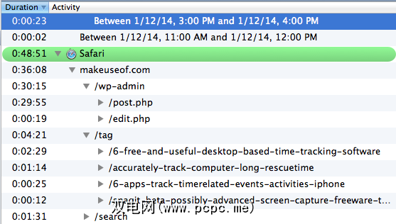 还可以对时序进行计时支持在各种应用程序中跟踪单个文档。在撰写本文时,Timing专门跟踪并报告了我在Photoshop中打开和处理的图像文件,在Safari中它记录了我访问的网站域和标题网页,以及这些页面在前面的时间。例如,这种报告使我能够看到我花了多少时间在WordPress上对本文进行编辑和校对。