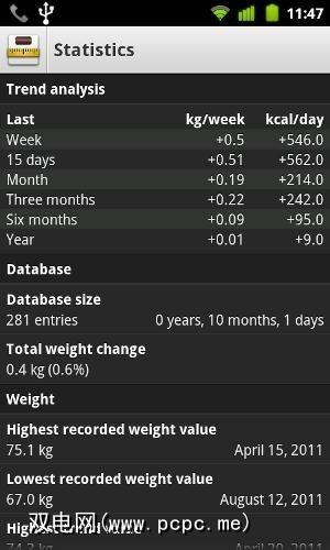 除图表外,天秤座使您可以查看显示不同时间段内趋势的数字统计信息,以及“最高/最低"体重/趋势值的“记录"。天秤座还提供了一个主屏幕小部件,该小部件显示了三个快速统计信息: