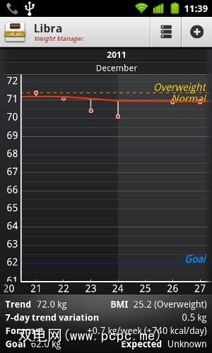 As您可以看到,原理是完全一样的,只有天秤座会添加大量重要信息。它知道我的身高,因此可以告诉我根据体重指数,我现在被认为是超重。顺便说一句,超重是25.0及以上–因此我仅略高于正常水平。这也显示出我实际上正在快速增加体重,这就是为什么当我达到最终的体重目标(62.0千克,约136磅)时“未知"的原因。我知道,如果我能为您展示令人印象深刻的减肥效果,那么这篇文章将更具戏剧性,因此下面是我过去的真实截图: