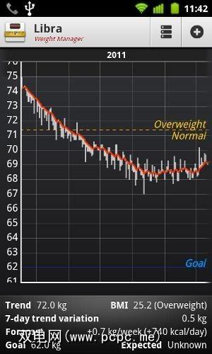 上面是我自己的体重图表的屏幕快照,从2008年5月27日开始。这是价值超过3.5年的数据,总共有1,300个数据点。那不是来自天秤座的屏幕截图:当我启动这张图时,甚至没有Android。这是我自己的自家制体重跟踪解决方案。我用AutoHotkey编码了第一个版本,然后用Ruby编码了下一个版本,直到今天,我与Libra一起使用。但是这个想法肯定不是我自己的,并且与Libra所使用的想法相同。