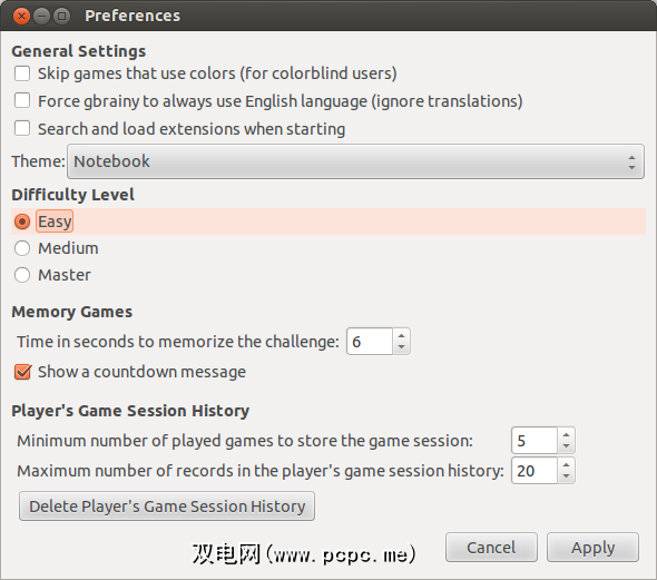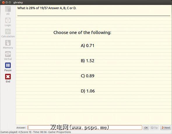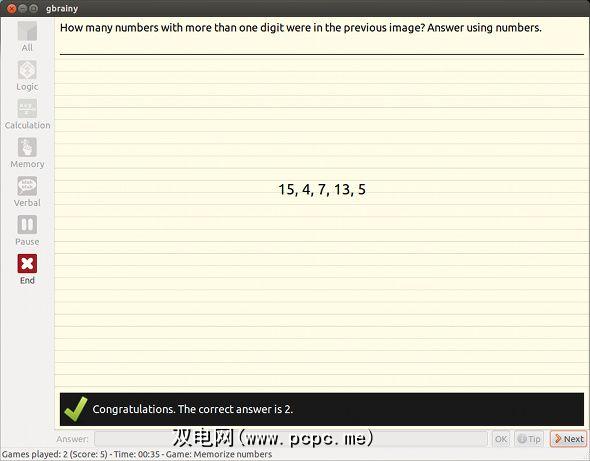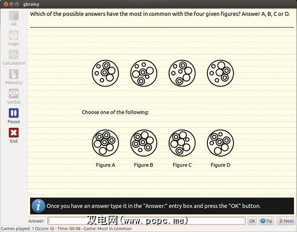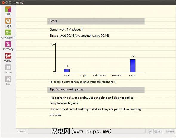 gbrainy是一个默认情况下附带的程序专注于Gnome桌面环境的发行版,例如Ubuntu。它提供了各种活动,您只需花费几分钟,就可以通过它保持剃须刀的锋利。它正在积极开发并定期发布新版本。