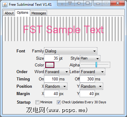 免费的次要文字(FST)是基于Java的工具,在您使用计算机时,该功能会在屏幕上闪烁次要的信息。默认情况下,文本会部分透明,因为在屏幕的随机位置会短暂闪烁。您可以在工具的 Options 选项卡中自定义这些设置。