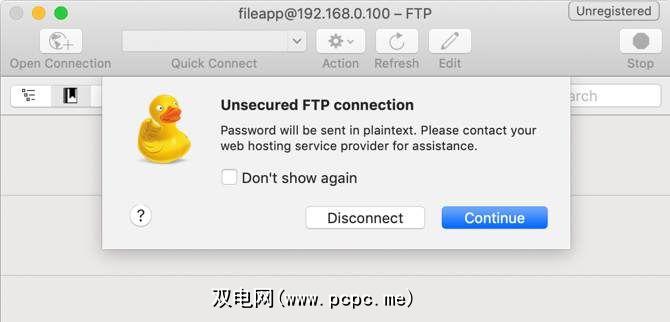 您的FTP客户端很可能会发出警告您认为连接不安全。如果您在家庭网络中,则无需担心。但是,如果您担心邻居试图监视您,则可能要使用其他方法。