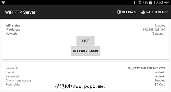 我免费使用名为WiFi FTP服务器的应用程序。它获得了4.5颗星(超过2,000多个评分)的高度评价,易于使用,并且会定期更新,但是具有非干扰性广告。安装完成后,只需点击开始按钮以打开服务器模式即可。