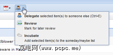 Jello为Outlook带来的功能不是整个电子邮件客户区域都嵌入了添加的GTD工具。例如,单击人员图标,您会看到您可以立即将基于电子邮件的任务委派给您的联系人之一,或者您可以将电子邮件标记为以后进行审核(并在稍后获得报价器)。 ,或“孵化"电子邮件,这意味着它将被添加到您的Jello导航主菜单的“某天/也许" GTD列表中。