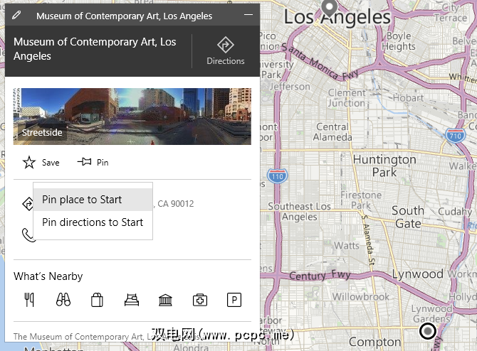 更好的是,您可以将特定位置或指向该位置的方向直接保存到“开始"菜单中。在地图应用中搜索以查找您想要的位置。将会弹出一个窗口,其中包含地址信息,电话号码和其他任何重要信息。在此窗口中,点击 Pin 按钮。您可以选择固定单个地点或该地点的路线。
