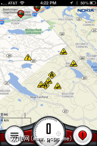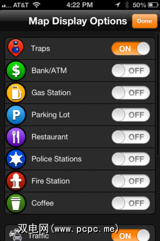 地图下方左侧的按钮是您可以根据自己的喜好调整显示的地方。您可以选择屏幕上显示的信息种类,这非常有用。默认情况下,该应用程序仅显示有关陷阱的信息,但您也可以将其设置为显示餐馆和其他景点。您甚至可以关闭某些类型的通知,因此,如果您不担心流量之类的问题,可以将其从视野中删除。