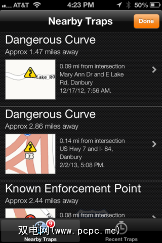 您可以使用菜单查看附近陷阱和警报的列表,这是开始之前的好地方开始您的旅程。您还可以点击“最近的陷阱"以查看其他用户刚刚报告的项目列表。