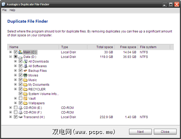 该免费软件具有非常简单的直观界面。该过程首先选择要包含在搜索中的驱动器和文件夹。该程序还可以扫描USB驱动器之类的所有可移动媒体,查找重复的内容。