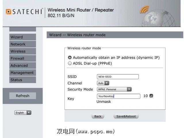 在下一个屏幕上,选中“自动获取IP地址(动态IP)"。然后创建您的SSID。将频道设置为自动。将安全模式更改为 WPA2个人。创建密钥,然后单击“保存并重新启动"。这应该是您使用的默认模式,并且应该在90%的时间内都能正常工作。