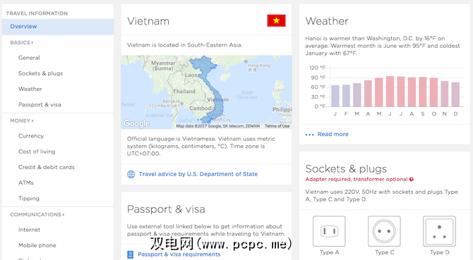 Base Trip是一个很棒的站点,它照顾了所有基本信息。选择您的出发地和去向。该网站将创建您需要了解的备忘单,并比较这两个国家。这包括天气,那里使用的插座和插头,货币,小费规范,互联网和移动通信,出行,大使馆信息等。
