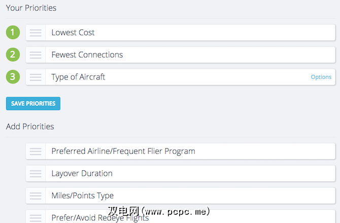 优先级列表包括成本最低,连接最少,飞机类型,首选航空公司或飞行常客计划,停留时间,里程/积分类型,可退款机票,避免红眼飞行和机载Wi-Fi。