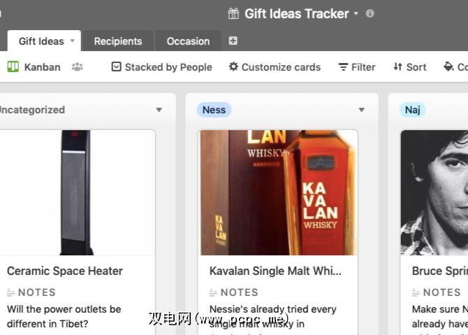 在在此视图中,Airtable允许您创建新的堆栈(以Trello的方式列出),并四处移动卡片以进行组织。您还可以对卡片进行排序,过滤和自定义卡片上显示的详细信息。