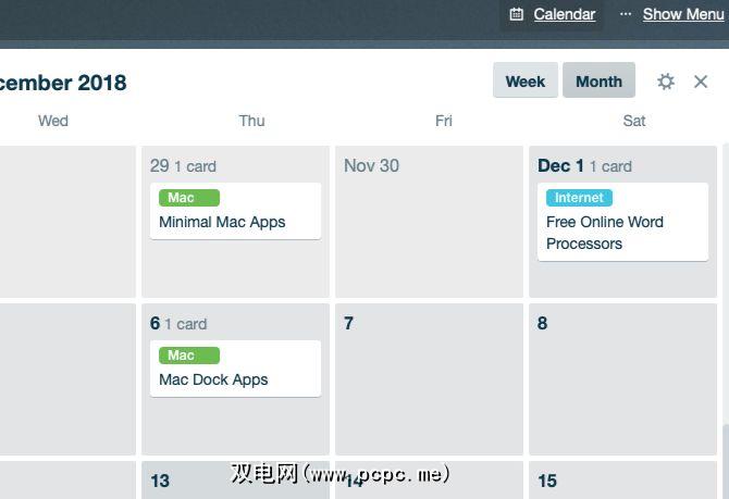 启用Power-up后,您会在左侧看到一个 Calendar 按钮显示菜单按钮。单击前者会显示日历视图,这是拖放技巧的作用。当然,只有分配了到期日期的那些卡片才会显示在该视图中。