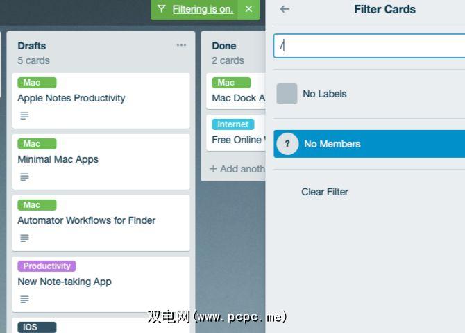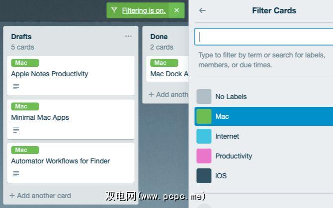 所有您需要做的就是单击显示菜单>过滤卡,然后选择从显示的列表中正确标签。 (可以选择多个标签。)这将隐藏该板上的所有卡,但不包括与您选择的标签匹配的卡。由于它们出现在板上的常规位置,因此更易于扫描。