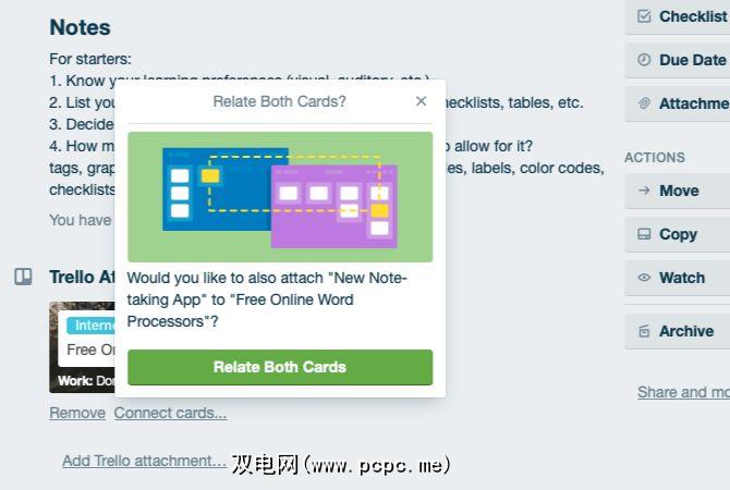 您甚至可以通过在附件中单击来跳至附件。如果单击附件下方的连接卡链接,则可以要求Trello“关联"或反向链接两张卡。这会将当前卡作为附件链接到另一张卡中。单击同时关联两张卡按钮以继续。