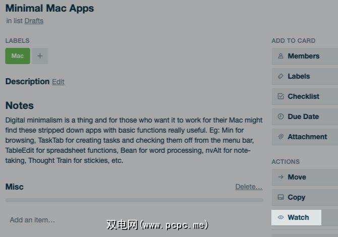 只要您的Trello团队中的任何成员对特定卡进行更改,都想获取更新吗?您可以通过观看按钮关注这些即时贴。您可以在卡片背面的操作列表中找到它。