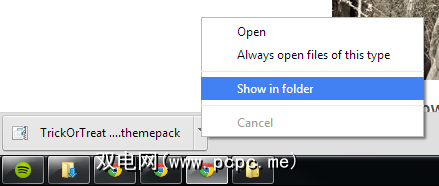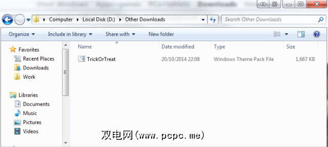 选择“打开"将立即执行文件。如果您安装了正确版本的Windows(请参阅选择Windows主题包),它将立即安装主题并更新您的桌面。选择“在文件夹中显示"将打开您的下载文件夹,您可以在其中访问文件。进入下载文件夹后,您可以双击Trick or Treat主题包: