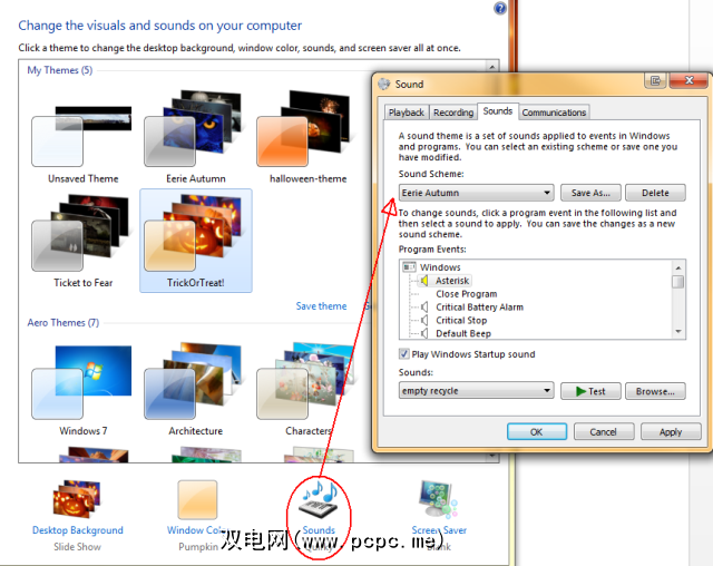 也许修改Windows主题的最好部分就是声音。我们的示例主题包“捣蛋"附带了12种新的声音,您可以通过个性化面板访问这些声音,您可以在以下屏幕截图中看到: