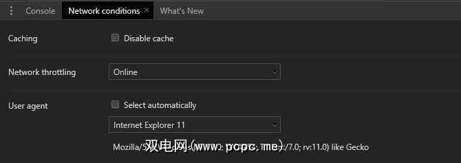 在网络条件标签上,取消选中自动选择然后您可以从列表中选择一个新的用户代理。刷新以使用新代理更新页面。