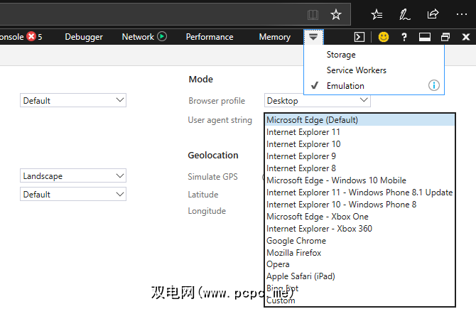 在此处,将用户代理字符串框更改为诱使网站认为您是其他人。您还可以将浏览器配置文件从桌面更改为 Windows Phone ,以查看网页的移动版本。像Chrome一样,这仅在开发人员工具面板打开时适用于当前选项卡。