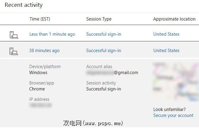 要进行检查,请访问Microsoft帐户安全页面,然后选择查看活动按钮。浏览一下您最近的登录信息,看看是否有任何东西看起来像鱼。您可以展开每个条目以查看其来自哪个平台和浏览器,以及登录是否成功。