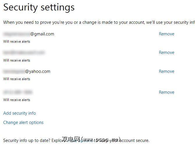 单击添加安全信息 >添加新的电话号码或电子邮件地址。您必须使用发送给他们的代码来验证新方法。点击更改警报选项,确定哪些联系方式会收到帐户警报。
