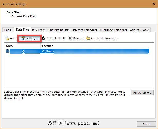 要用密码保护PST,请在桌面上打开Outlook,然后选择文件>帐户设置>帐户设置。切换到数据文件标签,然后单击要保护的PST(可能只有一个)。点击上方的设置按钮,然后点击更改密码。添加最多15个字符的密码,然后单击确定进行设置。