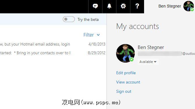 如果您有一段时间没有更新密码,最好立即进行更改。登录到您的Outlook帐户,然后在页面的右上角单击您的名称。选择查看帐户以访问您的Microsoft帐户设置。