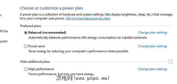 Windows默认情况下还提供了省电计划和高性能选项。 平衡计划是大多数用户的最佳选择,因为它会根据您的工作情况自动调整用电量。选择高性能计划并不能真正带来任何其他好处。