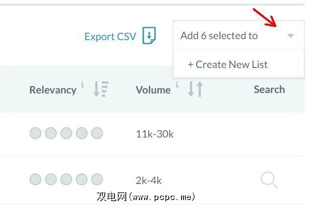 返回搜索字词页面,其中列出了搜索量。在该页面上,您将选择并选择对您最重要且数量最多的字词。您可以通过单击每个术语旁边的复选框来添加要遵循的术语,然后使用页面顶部的下拉框将这些术语组织到您自己的个人列表中。