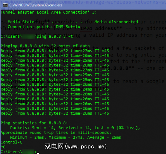 键入 ping 8.8.8.8 -t 会尝试访问Google服务器每隔几秒钟,直到您按 Ctrl + C 停止命令。