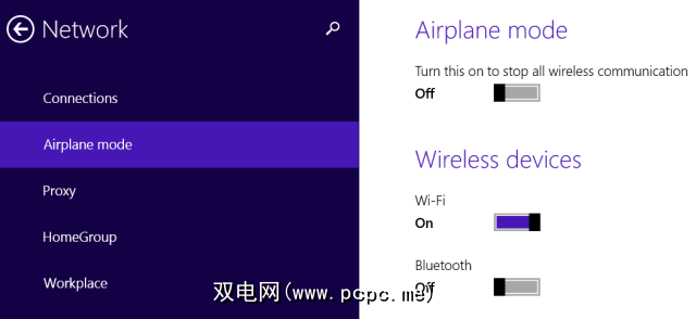如果Wi-Fi图标变灰,则您的PC可以处于飞行模式或仅可以禁用Wi-Fi。要对此进行检查,请从右侧轻扫或按Windows键+ C打开超级按钮栏。选择设置超级按钮,然后选择更改PC设置。在“ PC设置"应用中,选择“网络"类别,选择“飞行模式",然后确认飞行模式已关闭并且Wi-Fi处于打开状态。