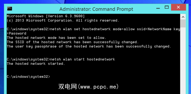 在命令提示符或PowerShell窗口中键入以下命令,替换NetworkName和带有您自己的名称和Wi-Fi热点密码的密码文本: