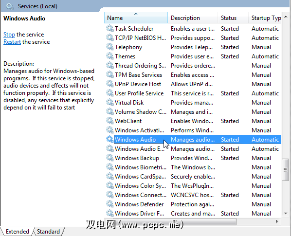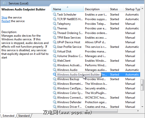 另一个快速修复方法是重新启动 Windows Audio Endpoint Builder ,通常位于< em> Windows Audio 。尽管此服务说它已经启动,但有时重新启动它可以解决音频问题。双击服务,然后选择停止,然后选择启动。