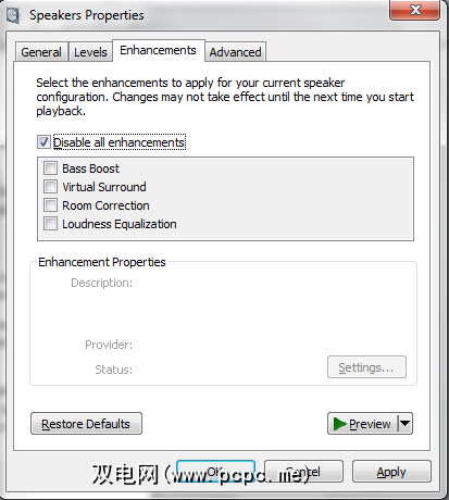 如果这不起作用,请尝试查看任何扬声器增强功能。增强功能是可选的音频效果,例如低音增强或虚拟环绕声。在某些情况下它们可能很方便,但也会引起音频问题。