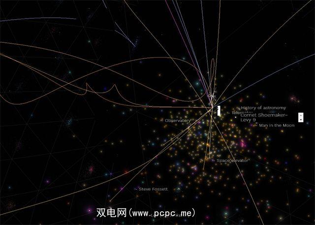 Wikiverse将Wikipedia的体验变成了外太空探索。缩小,您将看到相关的星座,有时又有重叠的话题或领域:自然,文学和历史构成了一个星座,文化,宗教和历史则构成了另一个星座。