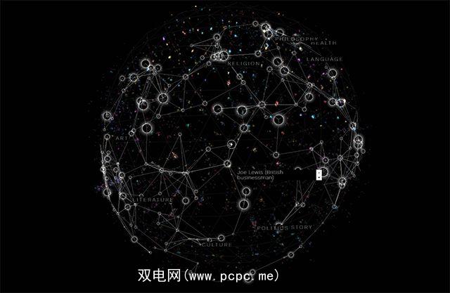 当您看到维基百科上的文章如何相互连接时,将会在整个Wikiverse中建立起连接网络。如果您想阅读有关任何给定主题的更多信息,只需单击右上角的“打开"按钮,即可在Wikiverse中查看Wikipedia条目。