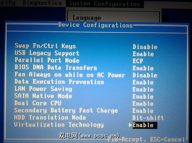 在设置Windows 10之前,重新启动计算机,进入BIOS并确保启用了 Virtualization Technology ;默认情况下,它是禁用的。根据您的BIOS,您可以在高级BIOS功能, CPU设置或其他类别下找到此设置。我在系统配置和设备选项下找到了它。只是四处摸索,直到发现它为止。