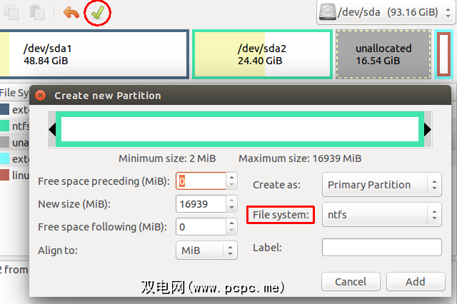 引导到包含GParted的Ubuntu LiveUSB中,该工具是对驱动器进行重新分区的工具。通过软件中心打开GParted,并创建至少16GB的未分配空间。右键单击未分配的空间,选择新建,确保选择 NTFS 作为文件系统,然后单击添加 。完成后,单击绿色的复选标记以应用所有操作。