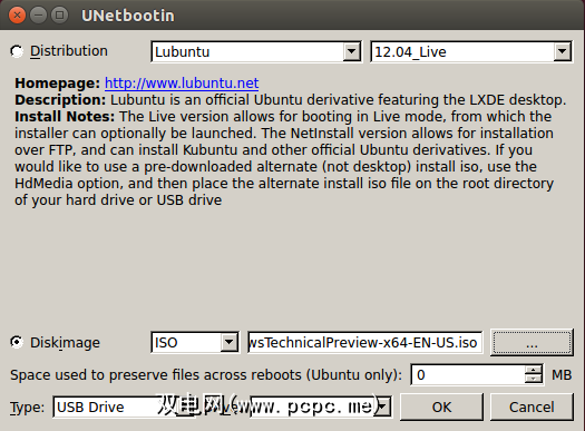 除了足够大的USB记忆棒(4GB +)外,还需要UNetbootin,该实用程序将帮助您创建可启动文件。 USB闪存盘。通过Ubuntu软件中心安装UNetbootin,打开该工具,将 Windows 10 TP ISO 文件设置为 Diskimage ,选择 USB Drive 作为键入,设置目标驱动器,然后单击确定。