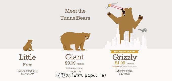 TunnelBear提供了三种计划;小,巨人和灰熊。 Little是一项免费计划,每月有500MB数据。巨人网络提供每月9.99美元的无限数据,而灰熊提供一年的无限数据,预付款为59.88美元。灰熊是最有价值的计划,每月的费用为4.99美元。