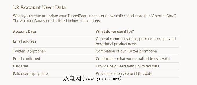 它确实存储的个人数据带有清晰的标记以及收集理由。 TunnelBear甚至不遗余力地提供了一些示例,说明了如何在性能和数据收集之间进行权衡。信用卡交易创建的数据将保持最低限度,以防止欺诈。如果提供您的财务信息让您有些不舒服,则可以选择使用比特币进行匿名支付。