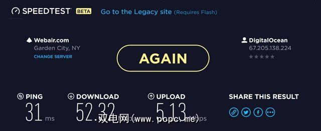 在没有VPN的情况下运行速度测试可提供60.67 Mbps,而美国TunnelBear服务器则可达到52.32 Mbps。我们希望速度会略有下降,这就是我们曾经拥有的速度。