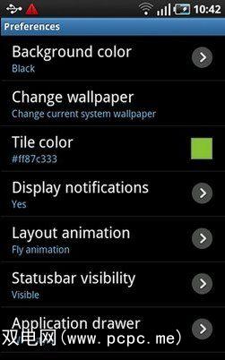 您可以在家中通过按Android菜单按钮来访问这些选项。屏幕,然后选择Launcher 7设置。这将为您提供更改背景颜色,添加墙纸,更改标题颜色,更改动画设置等的选项。在这里,启动器Pro的选项不多。但是,一次显示的内容也少得多。